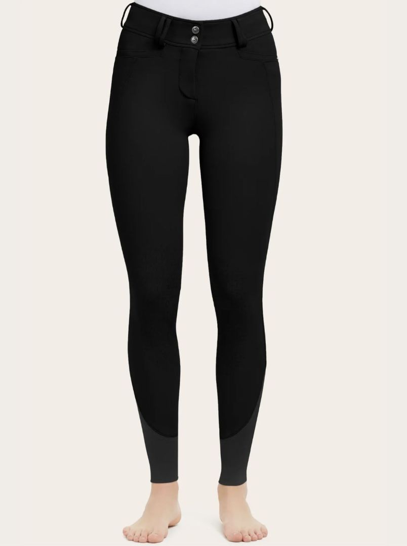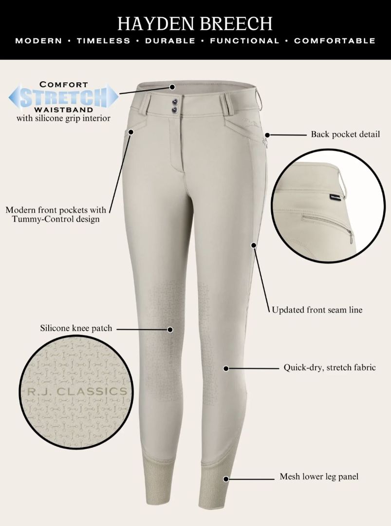 The Hayden breech offers sporty styling with silicone knee patches and subtle, updated details to keep your riding wardrobe looking modern. It features "The Perfect Rise," a mid-rise fit designed to keep you feeling and performing your best. The premium quick-dry and stretch fabric offers the perfect balance of comfort and structure.