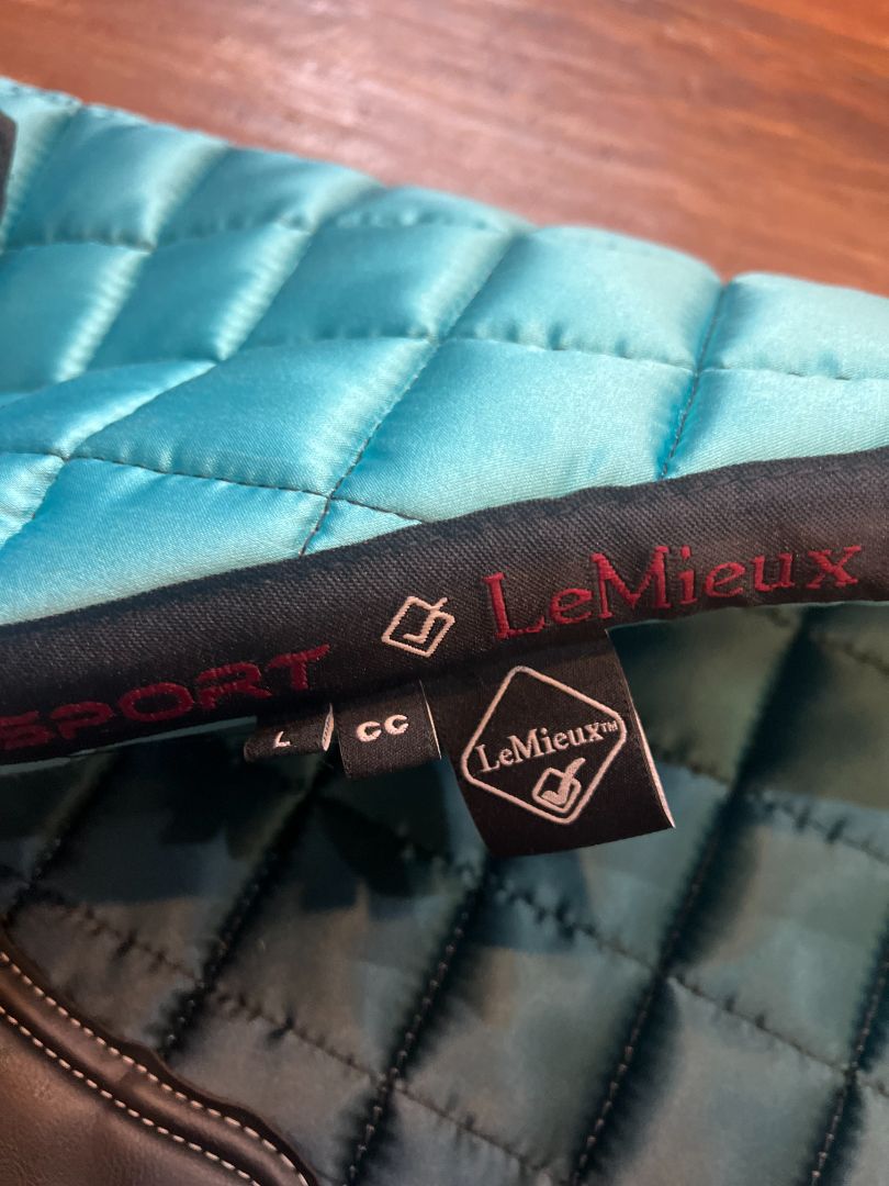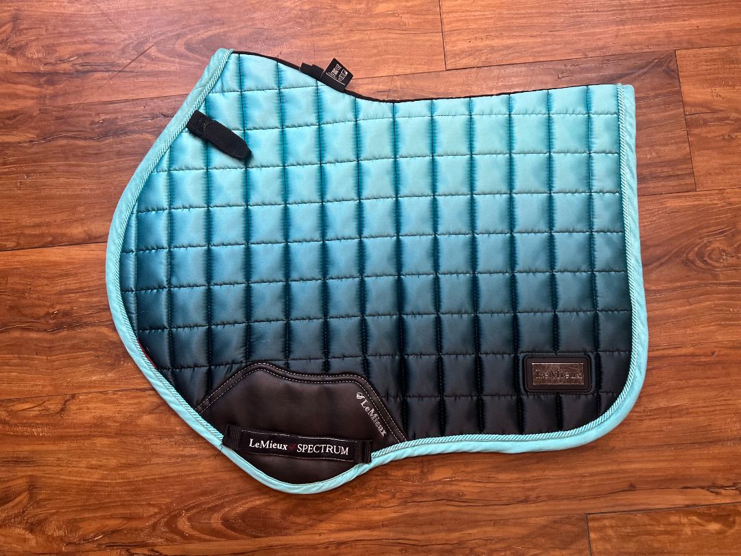 The textured pu leather girth protection area is complimented by an embossed logo and carries the usual signature LeMieux lower girth strap with its inner locking loops, and the D-Ring tabs hold the pad securely to the saddle